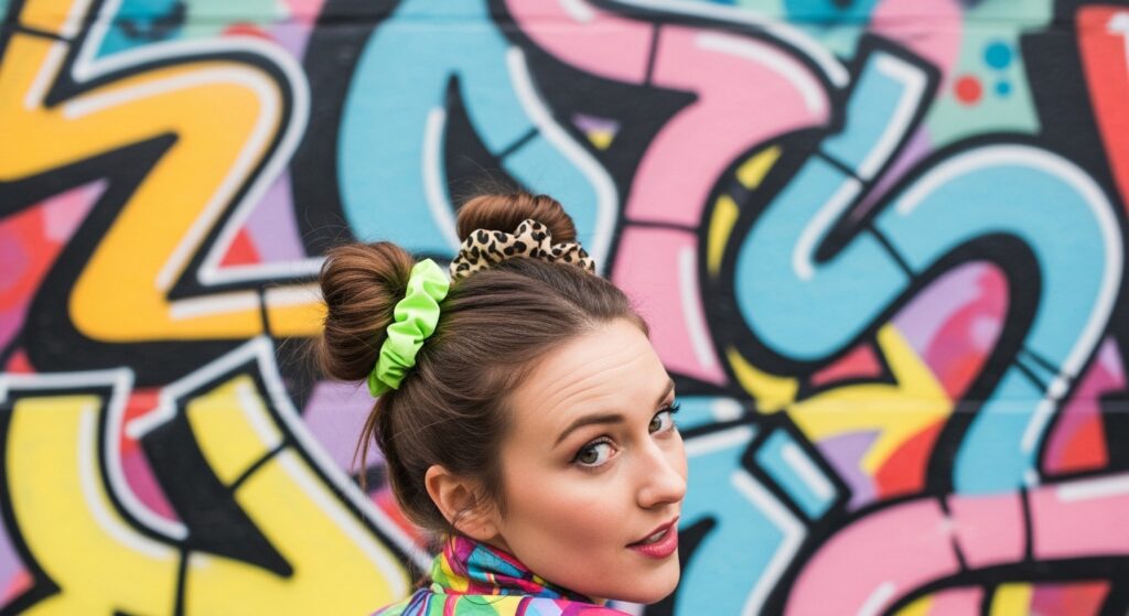 Channel your inner Gwen Stefani or Sporty Spice with the ultimate ’90s statement: space buns. Part your hair down the middle and create two high ponytails, each secured with a coordinating (or clashing—it’s the ’90s!) scrunchie. Twist each ponytail into a bun and pin it in place. Using scrunchies instead of plain elastics makes the style look cohesive and thoughtfully accessorized. This is a bold, joyful look that’s perfect for concerts, themed parties, or just embracing a fun mood.