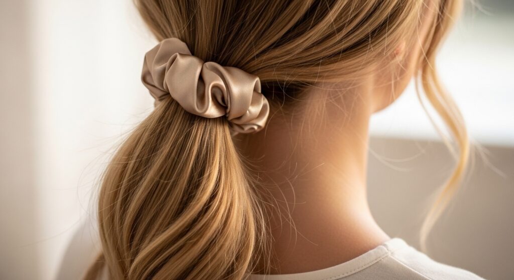 If high energy isn’t your vibe, the low scrunchie ponytail is your best friend. This style whispers cool-girl elegance. Think of Monica Geller’s more polished moments or the sophisticated ease of ’90s runway models. Create a deep side part for added drama, or keep it center-parted for a clean look. Brush your hair smoothly to the nape of your neck, but leave it a little loose at the crown to avoid a severe appearance. A satin scrunchie is perfect here, as it glides smoothly and prevents breakage while looking incredibly sleek. This style works beautifully on straight, wavy, and curly hair alike.
