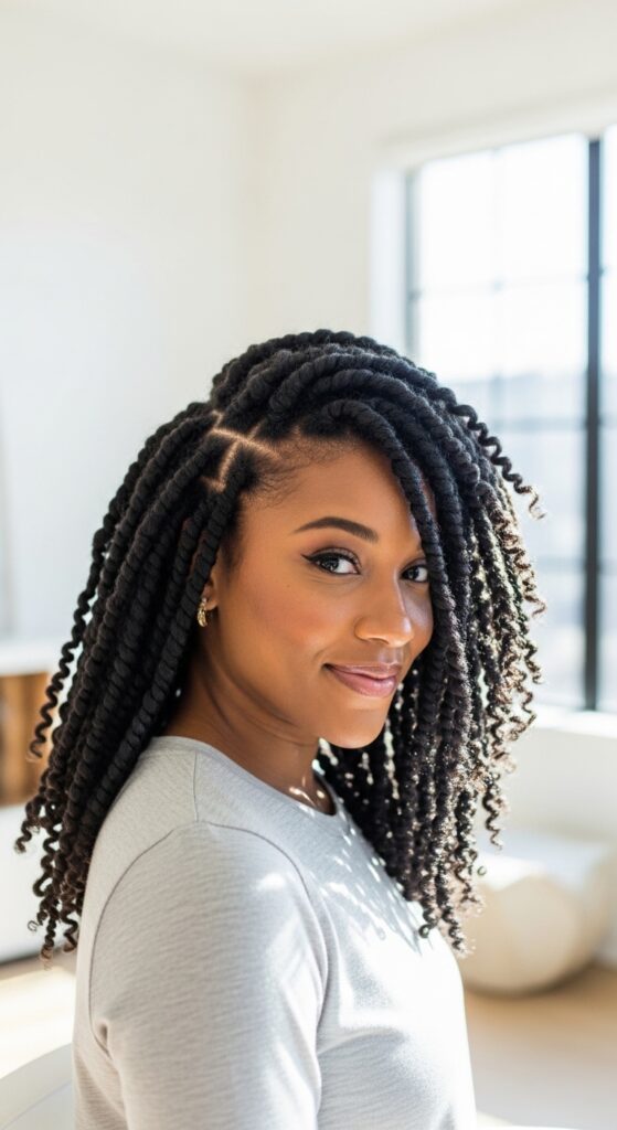 This style works beautifully with an “asymmetrical lob” because the chunky coils soften the sharp lines of the cut. It feels effortless and current, like something you would see on a fashion influencer. Plus, it takes less time to do than traditional coils.