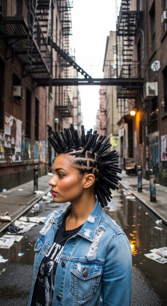 This style is a fantastic way to incorporate the “vampire haircut” vibe, with its sharp peaks and dramatic lines. It is perfect for concerts or whenever you want to feel a little more fierce. Just use strong-hold gel to keep the coils in place.