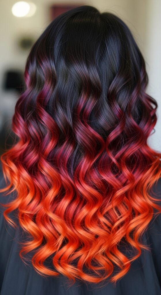Go from your natural dark roots through a spectrum of reds: burgundy, to true red, to fiery orange at the very ends. This is a bold, artistic statement that screams creativity and fun.