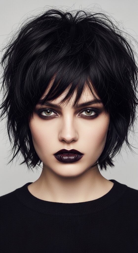 It’s mysterious, a bit undone, and very cool. Think less precision, more feeling. It’s a perfect match for dark hair and a love for romantic goth hairstyles.