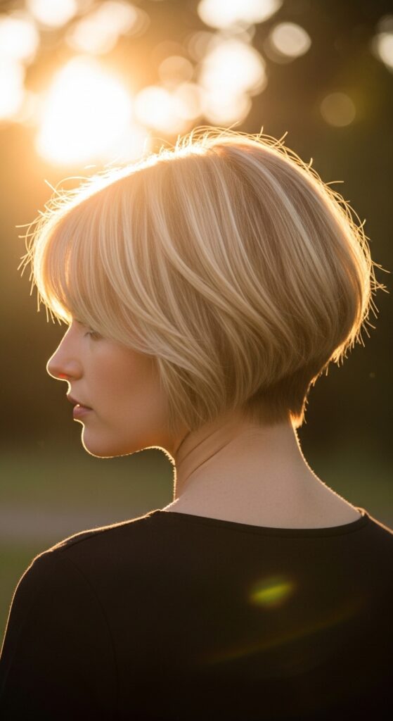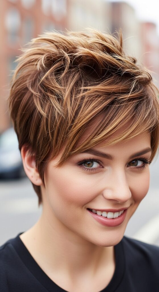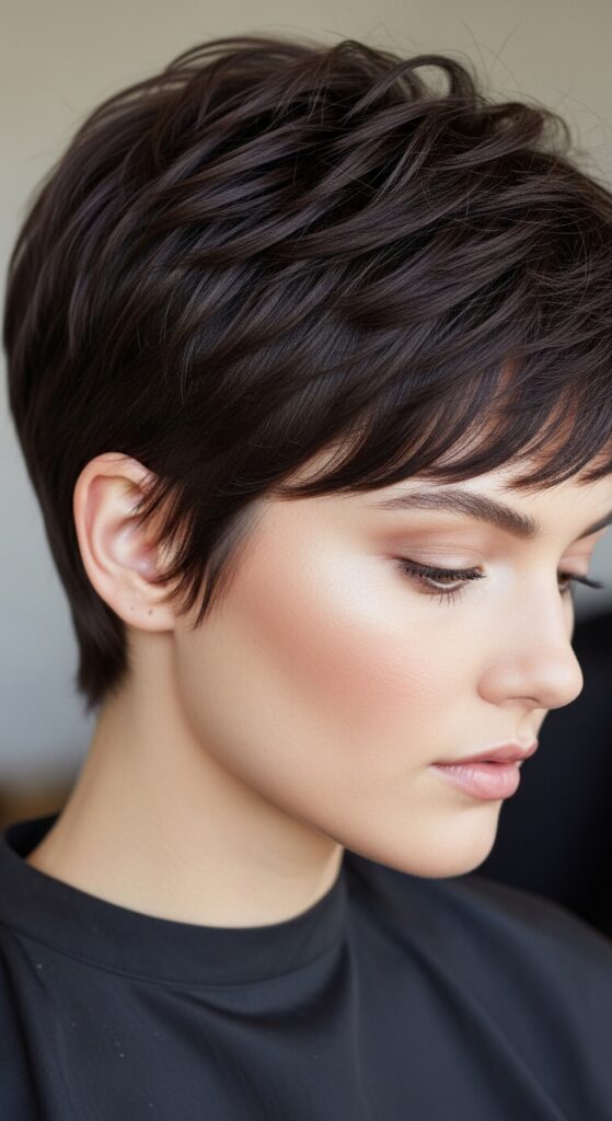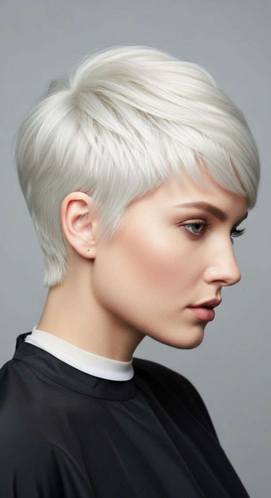 It’s a versatile choice if you’re not ready for an ultra-short top. It can even be tucked behind the ears. It offers a bridge between a short bob and a classic pixie.