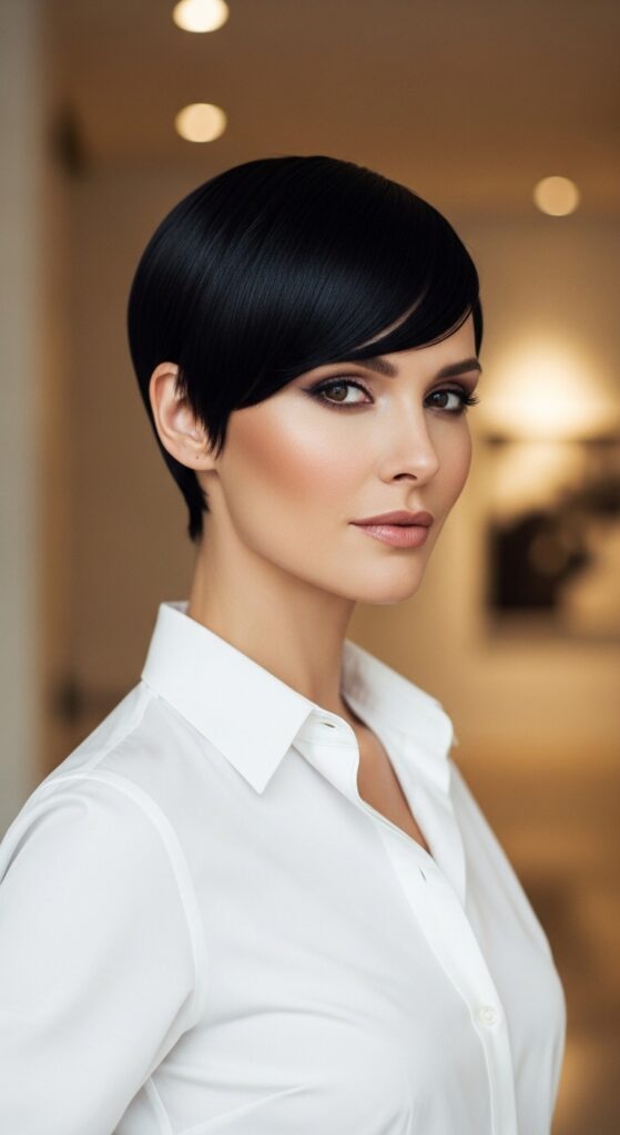 It’s a powerful, confident style that feels very of-the-moment. It turns your pixie into a sleek helmet of cool. Perfect for a big meeting or a night out when you want to make a polished statement.