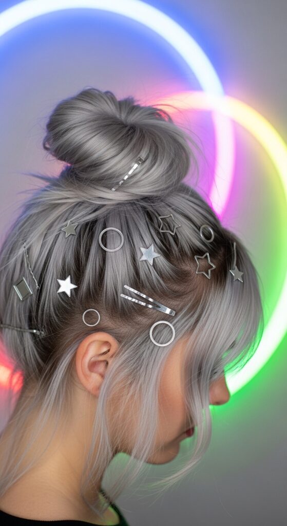 For a fun, futuristic take on a classic, try glitchy glam hair with space buns. Add small, colored hair clips or cuffs in an asymmetrical way. It’s playful, trendy, and perfect for a festival or a night out.