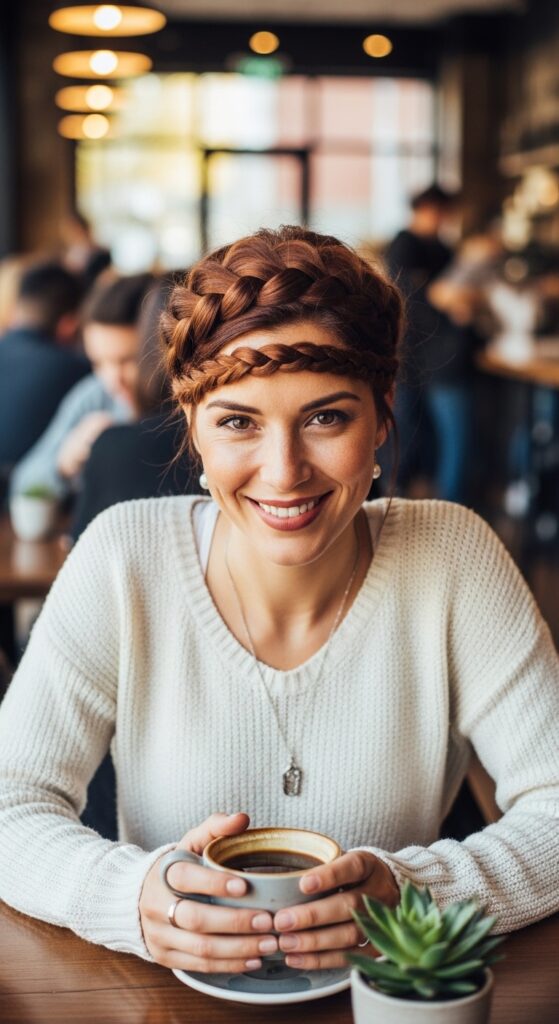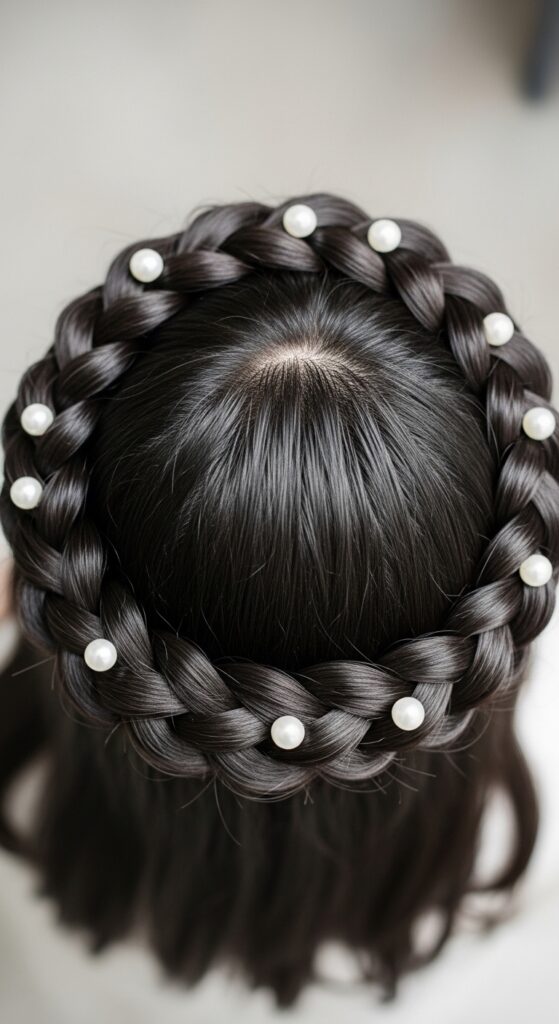 - Create a headband braid on one side and pin it behind the opposite ear.