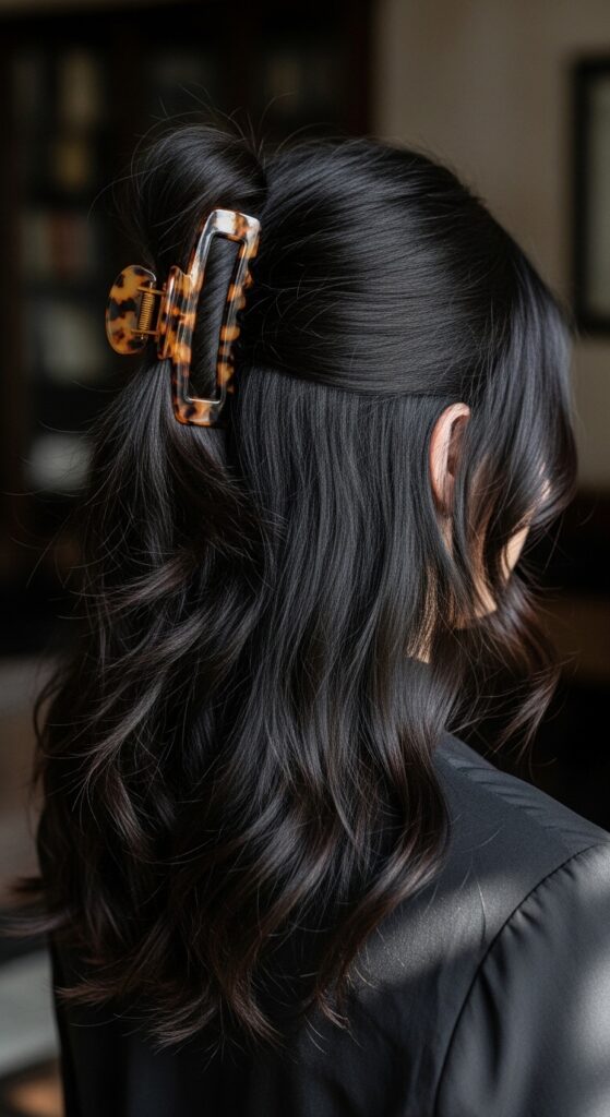 - Twist once and secure with a large, stylish claw clip, letting layers fall loose.