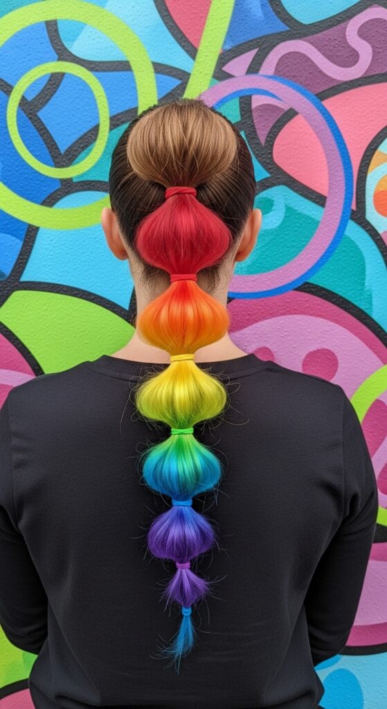 - Gently tug on each section of hair between the ties to create the “bubbles.”