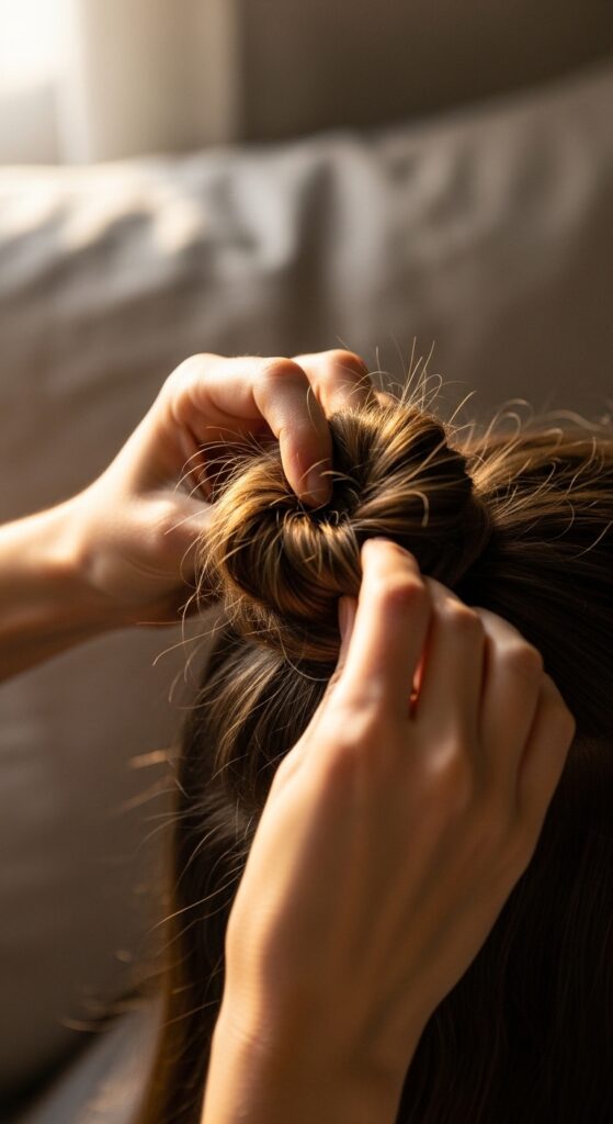 - Coil each twist into a bun at the top of your head and secure with a soft scrunchie.