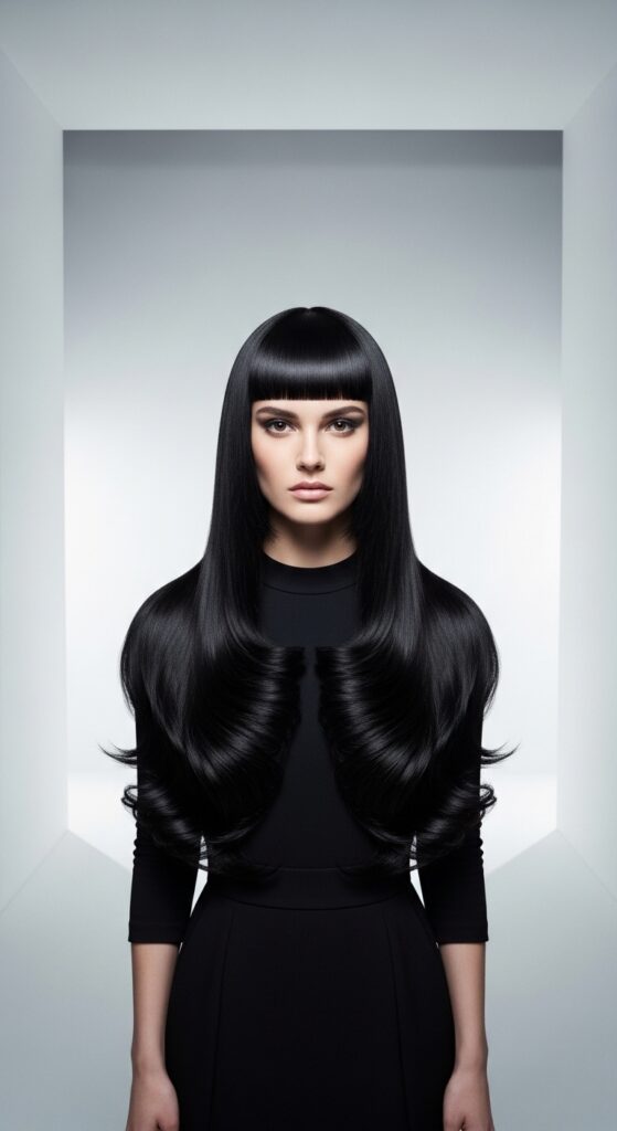The hime cut is a bold, beautiful style with strong, straight-across bangs and long layers. On vacation, let it air-dry for amazing texture. It’s a statement look that requires minimal styling.