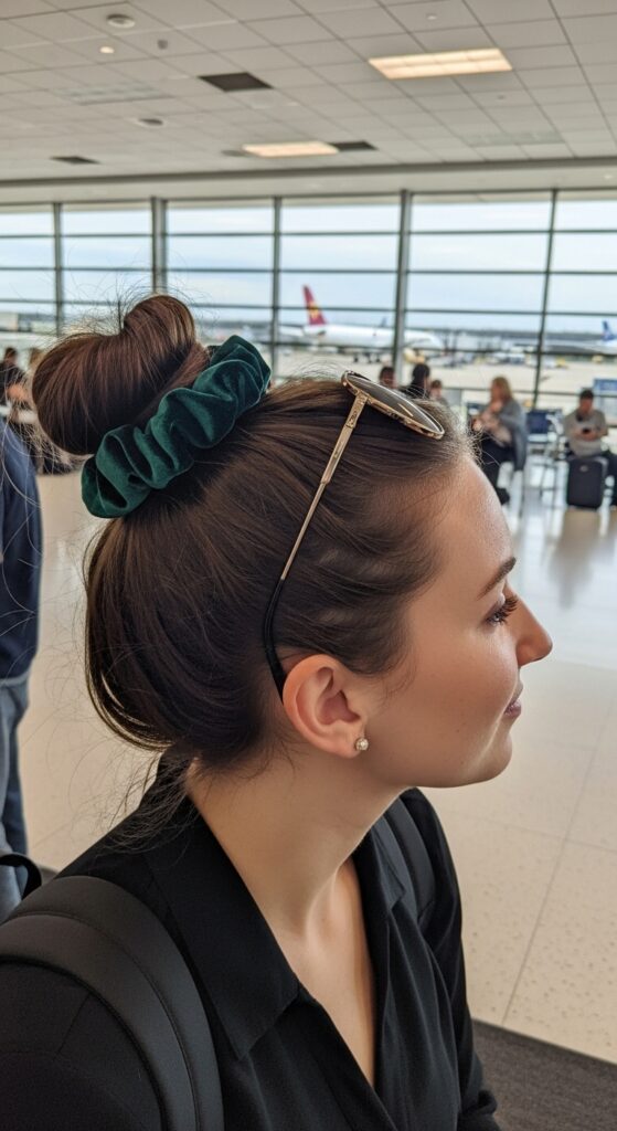 The ultimate easy updo. A top knot is perfect for beach days, long flights, or when you just need to get ready fast. Using a scrunchie adds a soft, retro touch and is gentler on your hair.