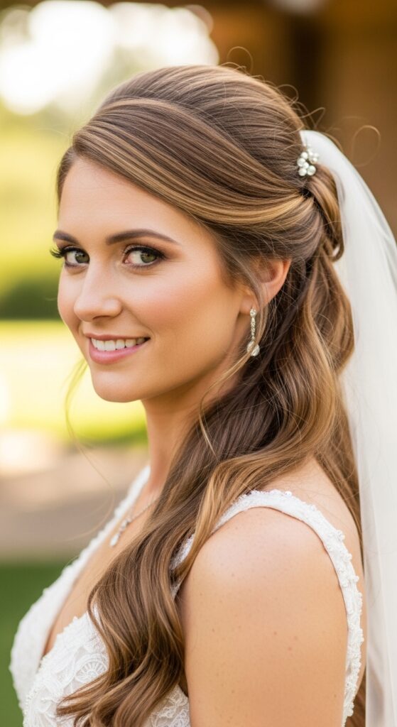 - Perfect for: Very long hair, outdoor weddings where wind is a factor, and a fairy-tale feel.