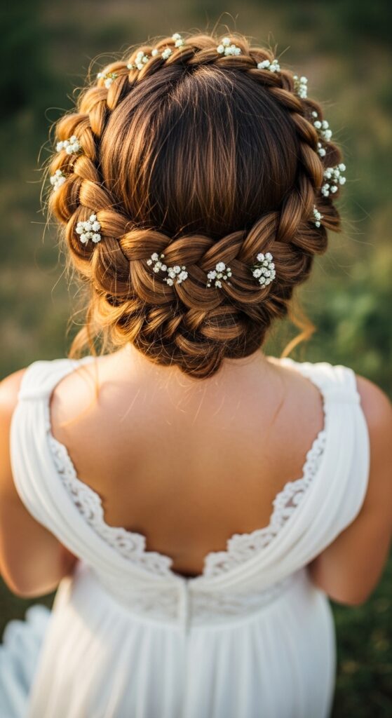 You can do a single thick braid or two thinner ones intertwined. Weave in small flowers or delicate pins for a touch of sparkle. It works beautifully with or without a veil.