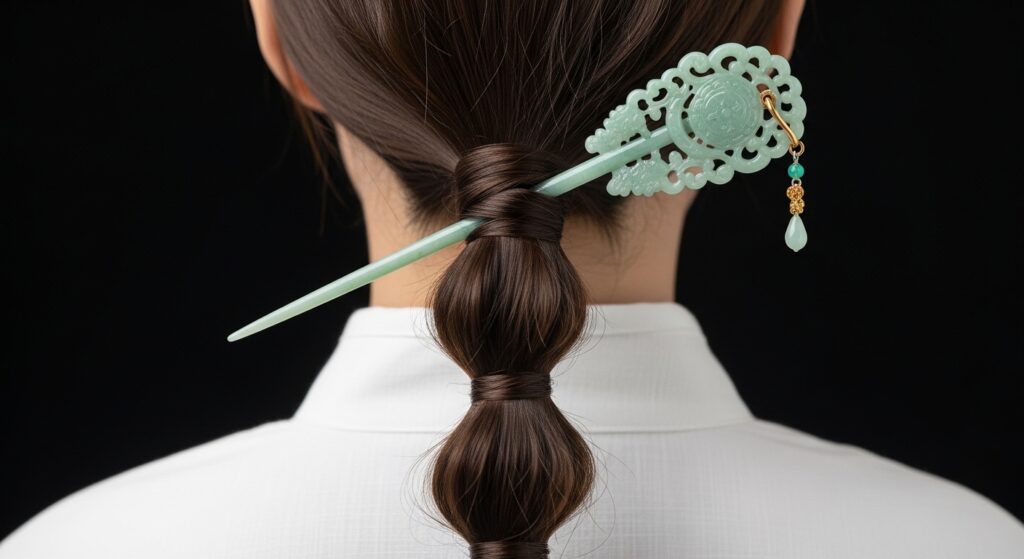 Secure your ponytail with a hair stick instead of a tie. Gather your hair, twist it, and coil it at the base, inserting a decorative hair stick through the coil to hold it. Then, pull out a small strand from the coil and wrap it around the base to cover the entry point of the stick.