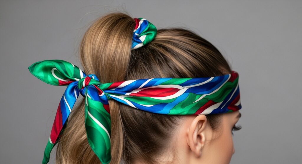 Incorporate a silk scarf for instant Parisian chic. Fold a long, narrow scarf into a strip. As you secure your ponytail with a tie, leave the scarf looped underneath it. Then, use the two ends of the scarf to wrap around the base, tying them into a small knot or bow. This is a perfect way to add a pop of color and pattern.