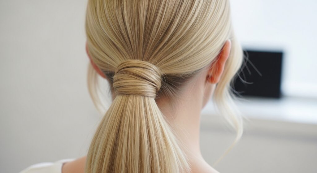 For a chic, modern twist, take two small sections from beneath the ponytail. Twist them individually tightly, then twist them together around each other to form a rope. Wrap this rope around the base and secure. The result is a clean, architectural detail that looks far more complex than it is.