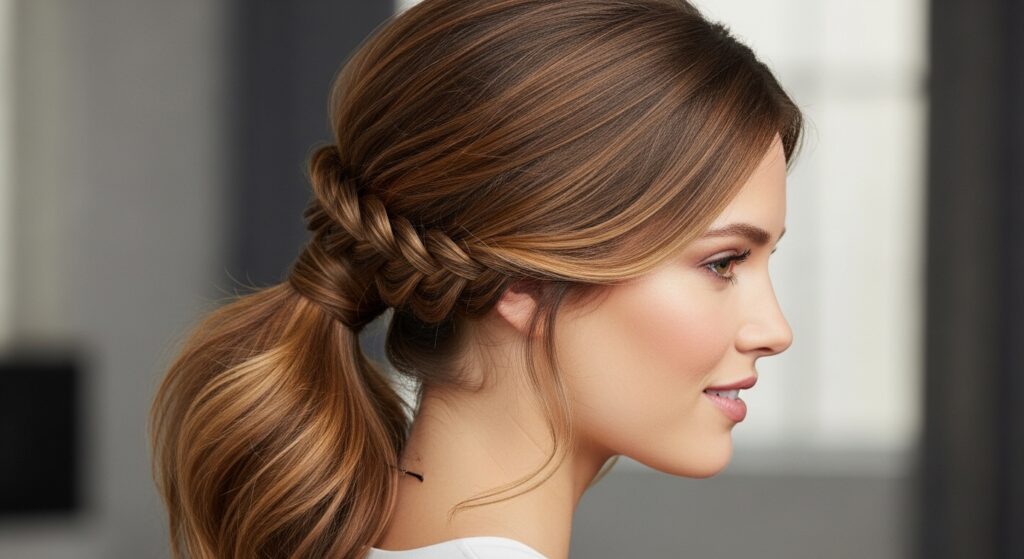 Swap the simple section for a delicate braid. Before gathering your ponytail, isolate a one-inch section from the front or side. Braid it loosely, then secure your main ponytail. Wrap the braid around the base and pin it. This adds incredible texture and a romantic, bohemian flair to an otherwise simple style.