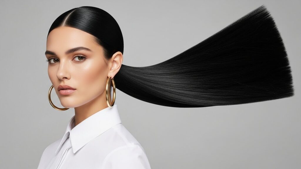 For an extra touch of luxury, take a small section of hair from underneath the ponytail and wrap it around the elastic, pinning it discreetly underneath. This little trick elevates the style from simple to salon-perfect. Finish with a strong-hold, shine-enhancing hairspray to lock in the sleekness. This style pairs impeccably with bold earrings and a sharp blazer, making it a go-to for professional settings or sophisticated events.