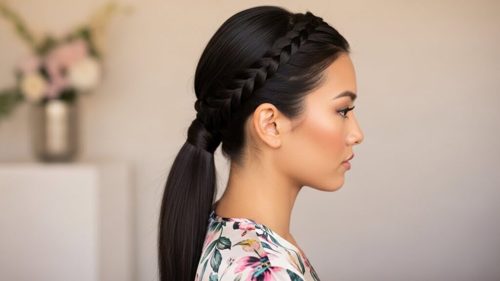 Alternatively, you can create a single Dutch or French braid starting at your hairline, incorporating hair as you go, and finishing by braiding it into the low ponytail. This style frames the face beautifully and adds a boho-chic or romantic element. It’s perfect for when you want a hairstyle that looks like you put in considerable effort (even if it’s quite simple to do) and is ideal for weddings, garden parties, or a special date night.