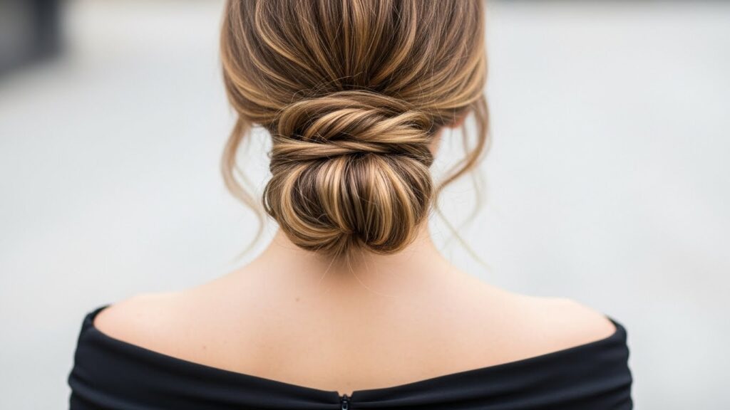 You can then arrange the loose ends around the base, tucking and pinning them to create a soft, knot-like bun. Alternatively, you can twist the tail and wrap it around the base before pinning. This style has a beautifully undone, Parisian feel—it’s elegant without being severe. It’s perfect for hot weather when you want your hair up but not stuck to your neck, and it’s a sublime choice for dinner dates, gallery openings, or any event calling for understated glamour.