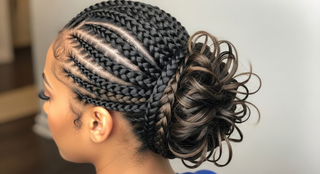 Why should all the glamour be reserved for loose hair? The flat twist updo with curly ends is a sophisticated and red-carpet-worthy style that beautifully showcases texture. This look involves flat twisting the hair along the scalp to create intricate, eye-catching patterns, while leaving the ends out to form a cascade of curls or a defined puff.