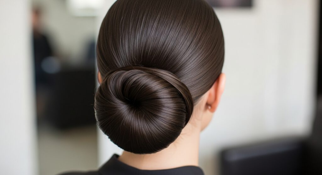 How to do it: Apply a strong-hold gel or smoothing cream to damp or dry hair to eliminate flyaways. Comb your hair back into a tight, high, or low ponytail, making sure there are no bumps. Instead of a messy wrap, carefully twist the ponytail and coil it neatly around the base, ensuring the ends are tucked completely underneath. Secure with pins that are hidden from view. The final look should be smooth, tight, and glossy, with the focus on the shape of the bun and your sharp hairline.