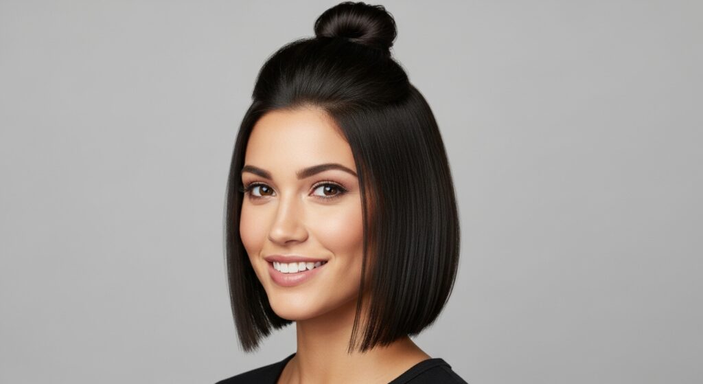 How to do it: Section off the top half of your hair, from about the crown of your head to your temples. Gather this section as if you’re making a ponytail at the very top of your head. Twist the hair and wrap it into a small, compact bun. Secure it with bobby pins or a small coil hair tie. The key is to make the bun tight so it doesn’t flop over. Once secured, you can gently pull at the sides of the bun to add a bit of volume and texture. Let the rest of your blunt hair hang loose, and you have an instantly elevated look.
