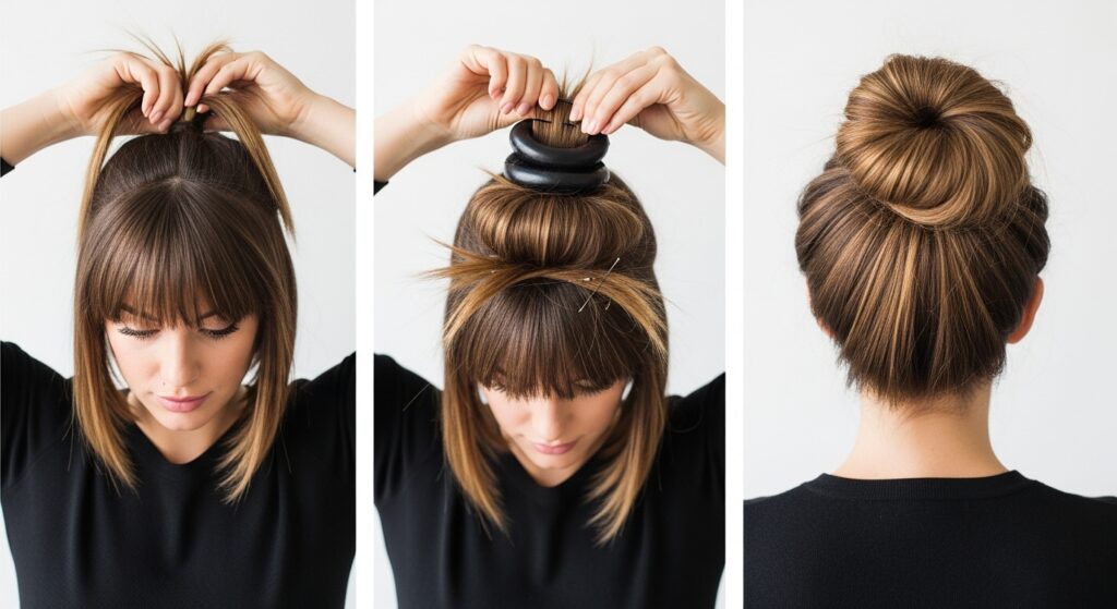 If your blunt hair is on the finer side or you’re struggling with length, a donut bun (or sock bun) is a classic hack for a reason. It gives you that full, perfect ballerina bun without needing long, layered hair. It provides the structure that blunt hair sometimes needs to hold a classic bun shape.