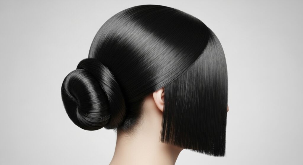 This style celebrates the sharp, clean lines of your blunt cut. It’s sleek, sophisticated, and all about embracing the geometry of your hair. This is the perfect bun for a job interview, a formal event, or when you just want to feel impeccably put-together.