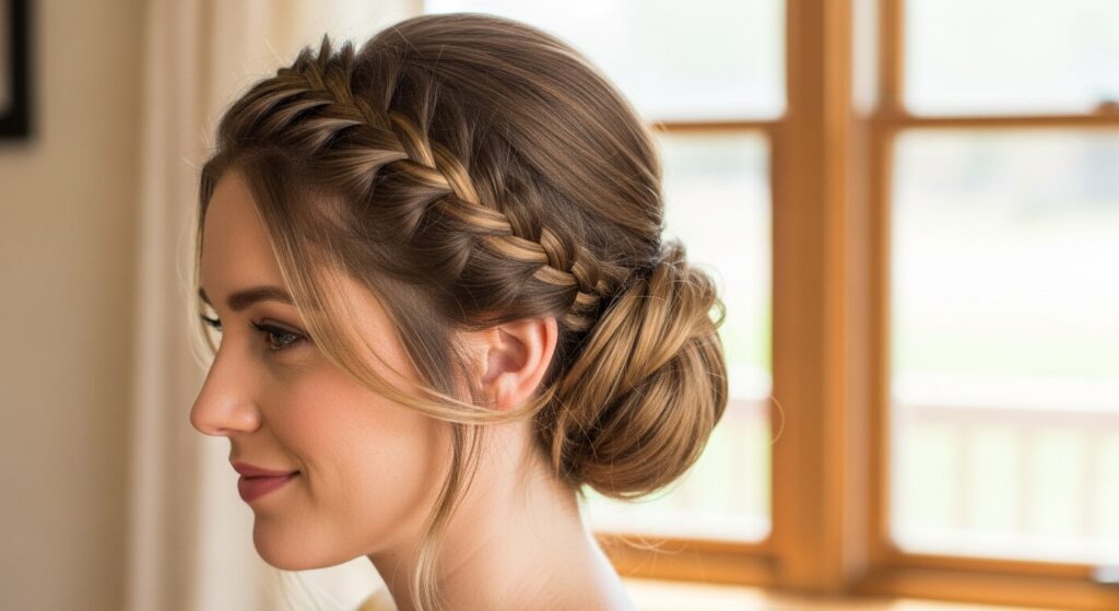How to do it: Create a deep side part. On the heavier side, take a section of hair from the front and begin a Dutch braid (an inside-out French braid) along your hairline, incorporating hair as you go. Continue braiding until you reach the nape of your neck on the opposite side. Then, combine the braid with the rest of your hair into a low ponytail. Twist or wrap the ponytail into a bun and secure it. The braid acts as a beautiful headband and ensures all your shorter, face-framing layers are elegantly contained.