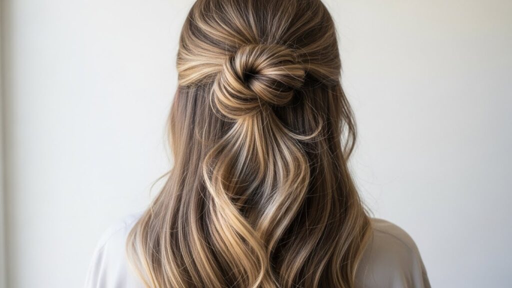 This look takes the classic half-up style and makes it feel fresh and modern. Instead of a simple top section pulled back, try a relaxed half-up knot or twist. Take a front section of hair from each side, twist them loosely backwards, and tie them together once in a single knot at the back of your crown. Secure with a small, clear elastic or bobby pins tucked underneath. Gently pull at the knot to loosen and fluff it. The rest of your hair flows down freely. It’s a five-second style that looks thoughtfully crafted, perfect for keeping hair off your face while showcasing your length.