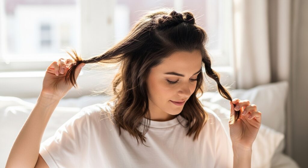 Start with damp (not soaking wet) hair. Divide your hair into two sections. Twist each section quite tightly away from your face, all the way down to the ends. Then, loosely coil each twisted section on top of your head and secure it with a loose scrunchie or a clip. You don’t want it tight, just secure enough to stay put. Sleep on it! In the morning, gently unravel the twists, run your fingers through your hair, and scrunch with a texturizing spray. You’ll be left with effortless, heat-free waves.