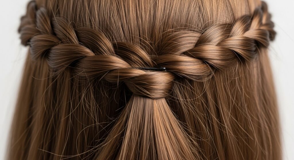 Begin by taking two small sections of hair from the front, one from each side above your temples. Instead of just pulling them back, twist each section inward (towards your face). Then, cross the two twisted sections over one another at the back of your head, as if you’re tying them in a single knot. Secure this with a small, clear elastic or a chic claw clip. Gently tug on the twists to loosen them and create a bit more volume. This creates an instant, elegant detail that looks far more complicated than it is.