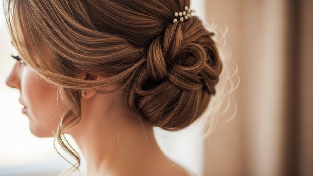 Think of this as the quintessential wedding or red-carpet updo. It’s a classic for photography because it’s designed to be seen from all sides. The updo itself—whether a chignon, twist, or knot—offers intricate detail and elegance from the back and sides. The deliberate, soft tendrils left around the face break up the hardness of the hairline, soften the features in the front view, and catch light beautifully in profile shots. This style says “I took care with every detail,” and the camera will reward that effort with flawless shots from every perspective.
