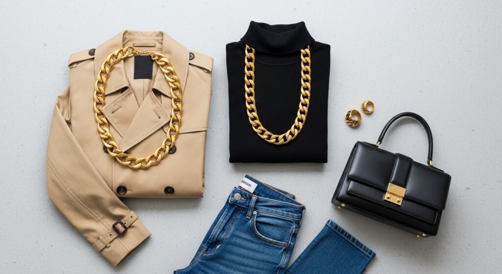 Think about swapping out your scattered pieces for a few intentional, slightly more substantial items. A single, bold signet ring instead of multiple stackable rings. A chunky, gold link chain worn alone. Structured, geometric earrings that make a statement. Even updating your everyday bag from a slouchy tote to a structured box or a curved, sculptural shape can make your entire look feel more considered and contemporary.