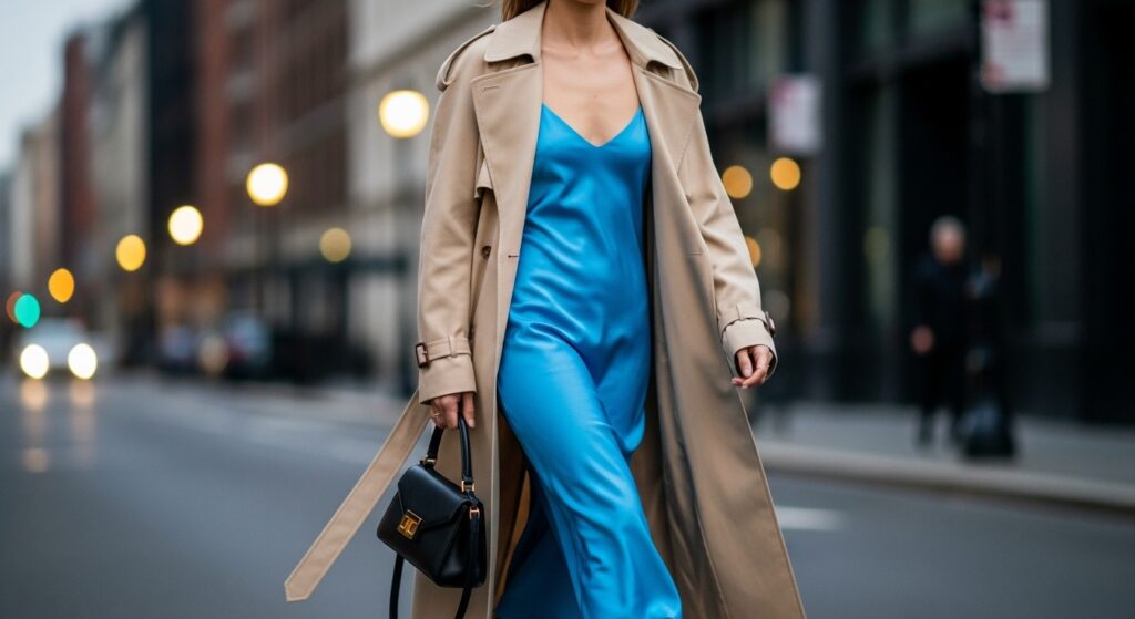 Try tucking your classic silk blouse into a high-waisted, wide-leg trouser for an elegant, elongated silhouette. Or, pair an oversized, slouchy blazer with a sleek slip dress and delicate heels. The contrast between volume and fit creates visual interest and feels intentionally fashion-forward, rather than safe. It’s about creating a new shape that still feels balanced and personal.