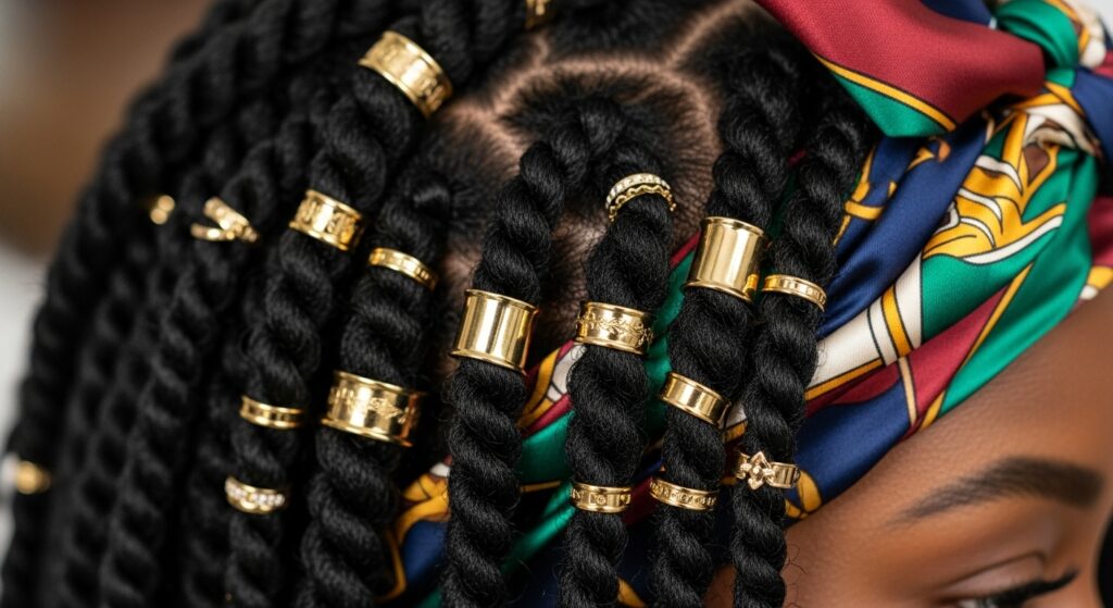 Never underestimate the power of accessories. A few strategically placed pieces can completely shift the focus and vibe of your style. Try adding gold or silver cuffs to a few face-framing twists. Wrap a vibrant silk scarf around your head as a headband. Use decorative hairpins to pin back one side.