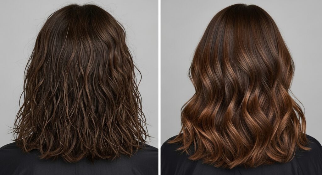 After brushing out, you can run a very small amount of anti-frizz serum over the top layer to polish the look. The goal is controlled texture, not flyaways.