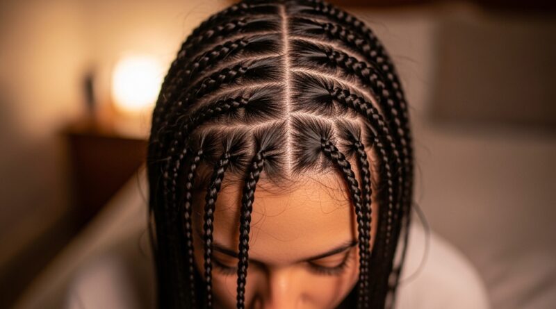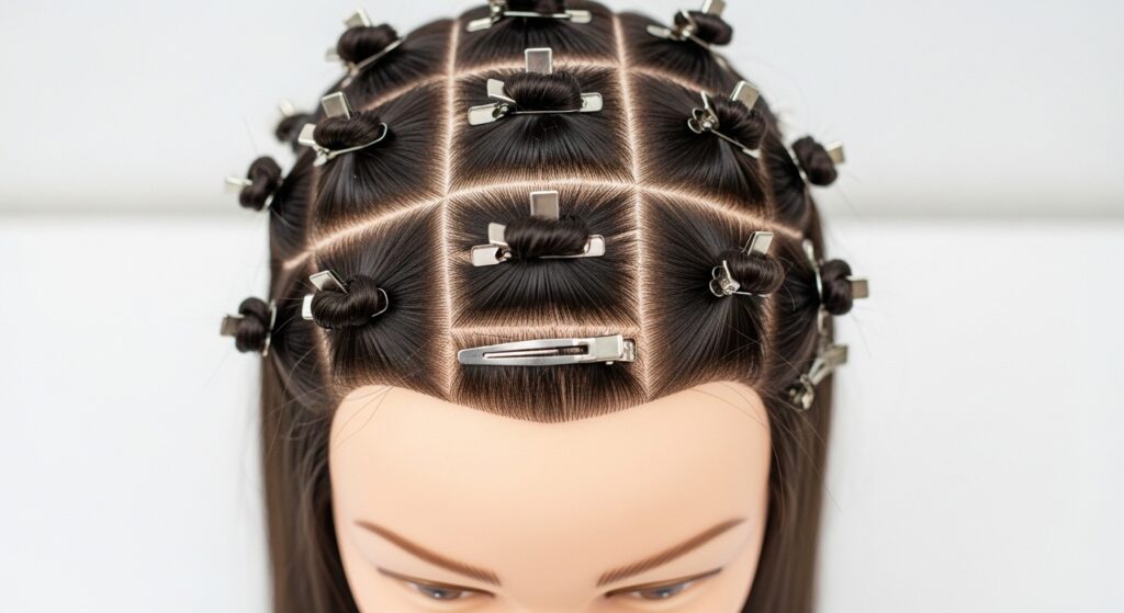 - Hair is neatly sectioned.