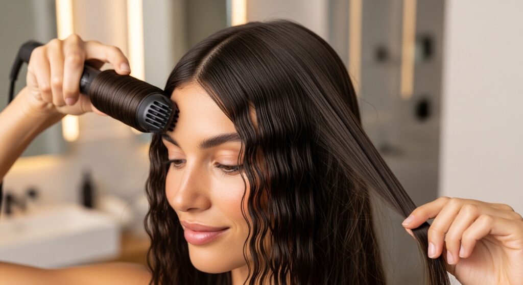You can also use a regular flat iron to smooth the very top for a polished root, leading into the textured ends. This contrast is very chic and aligns with 2026 hairstyles predictions focusing on mixed textures.
