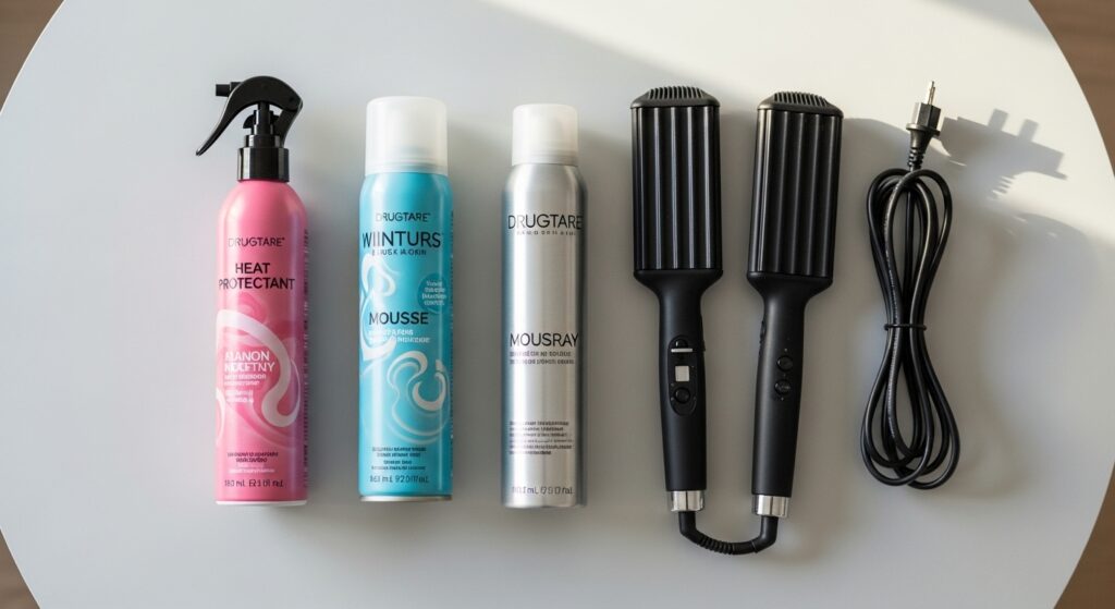 You don’t need expensive stuff. A reliable heat protectant, a affordable mousse for grip, and a flexible-hold hairspray are the trio. Brands like Not Your Mother’s, L’Oreal, and Aussie have fantastic options.