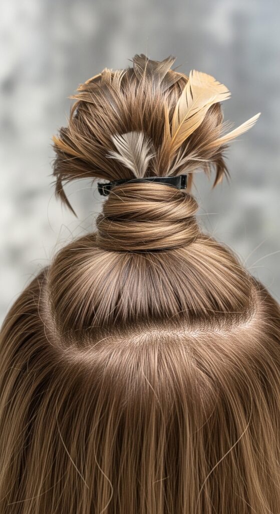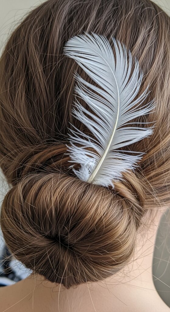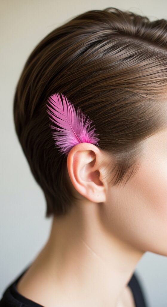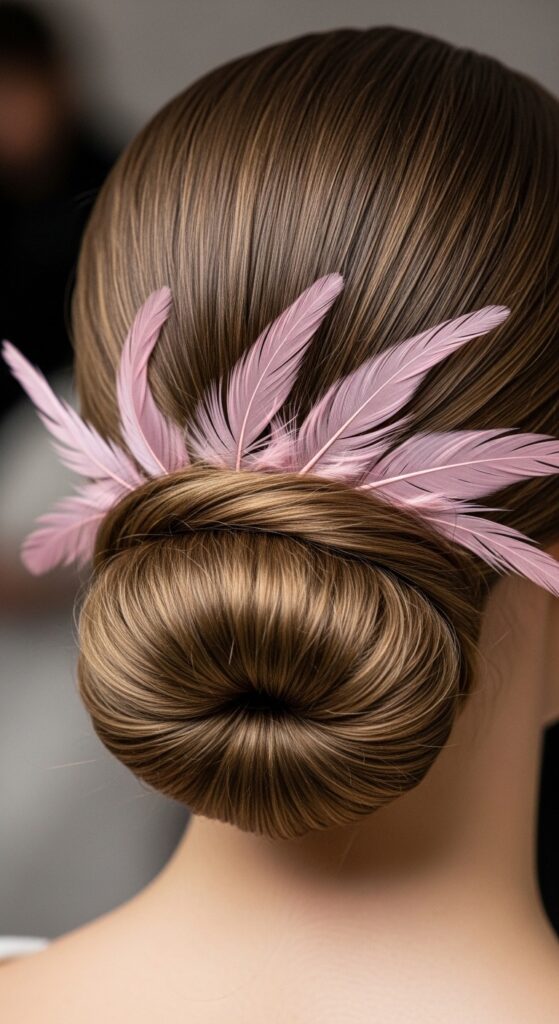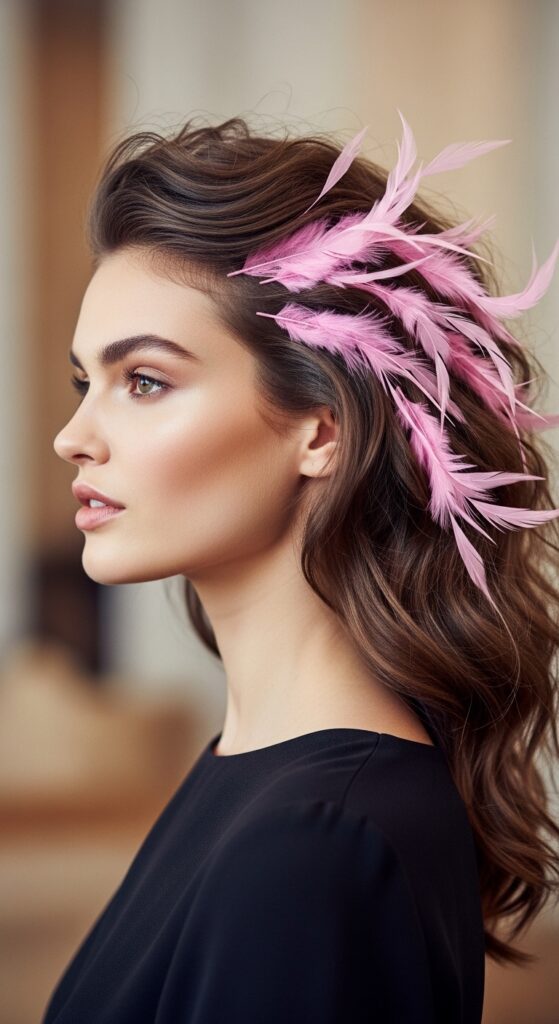 Then, add two or three pink feathers placed with precision—maybe following the line of your bun or nestled at the base of your ponytail holder.