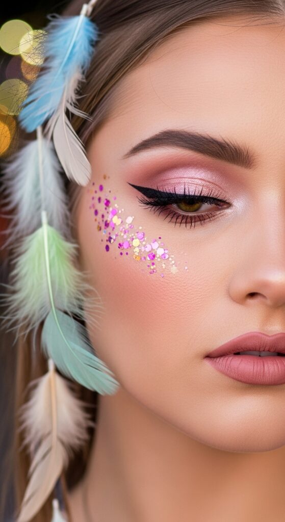 You don’t need to match your makeup to your feathers perfectly. In fact, a tonal approach is more sophisticated. Think soft pinks and peaches on the eyes or cheeks.