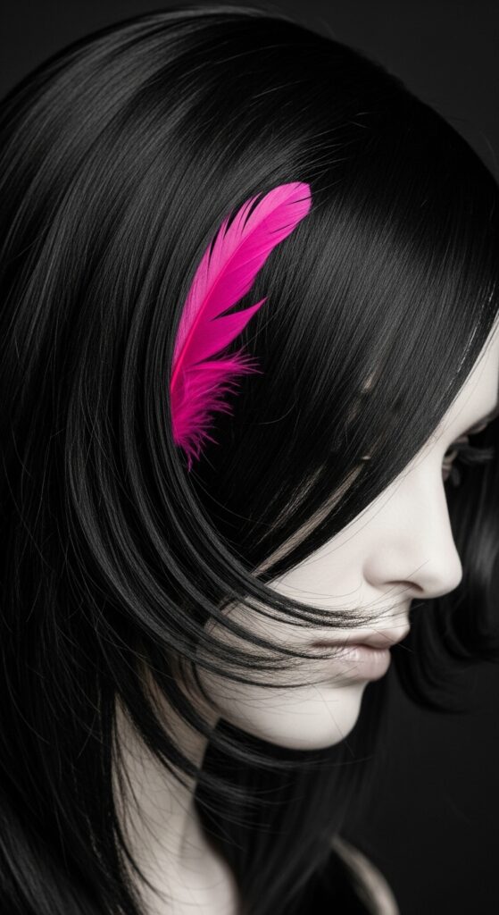 Add a flamingo pink feather deep within the interior layers, so it’s only visible when you move or turn your head. It’s a secret burst of joy against the dark hair.