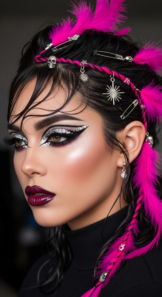 Add multiple feathers in a clustered, almost “glitched” pattern. You can even incorporate tiny silver rings or charms into the same sections of hair.