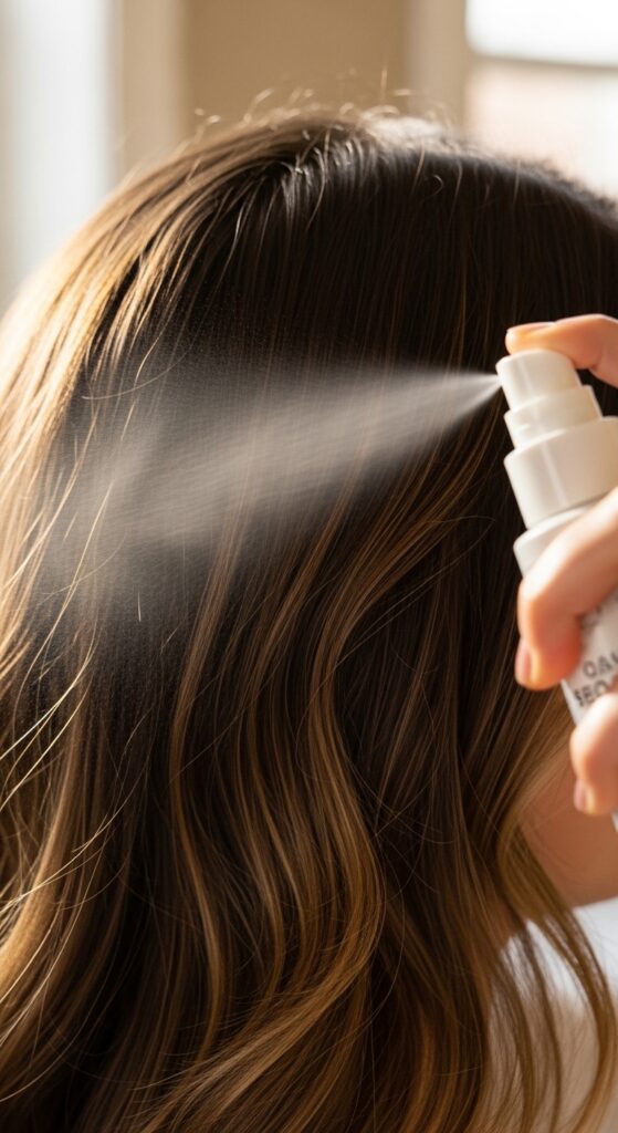 After styling, flip your head over. Hold a flexible-hold hairspray about 10 inches away and mist it lightly into the roots at the crown. Do not spray the lengths. This gives your root volume an invisible net of support without any stiffness or residue.