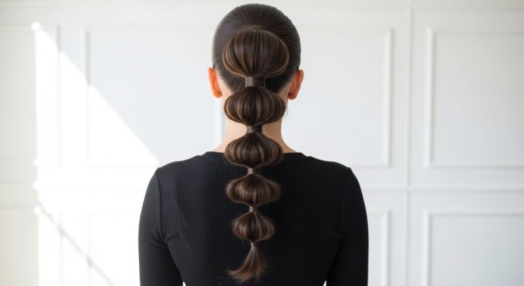 Secure a high or mid-height ponytail. Space out hair ties down the length of the tail, each about 3-4 inches apart. Gently puff out the hair between each tie to create the “bubbles.” You can keep it sleek or make it fuller.