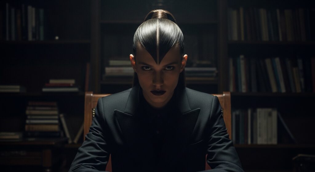 Channel dark academia or vampire haircut vibes with this deeply parted, ultra-sleek style. It’s mysterious, sharp, and intellectual. Perfect for making a statement in a creative field or on a day you want to feel powerfully cool.