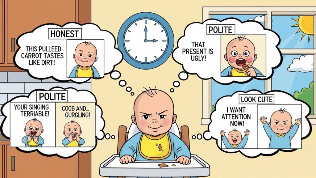 This whole situation has me thinking about why we’re expected to lie about babies. We don’t pretend every painting is a masterpiece or every meal is gourmet. But with babies? Suddenly we’re all supposed to gush like they’re the second coming, even when they look like angry potatoes.