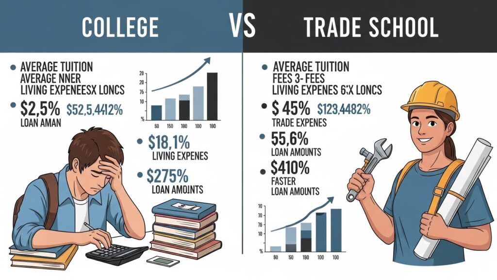 • Trade School Costs Less. The average trade program costs $33,000 total—way less than a 4-year degree. Why empty a $60k fund for that?
